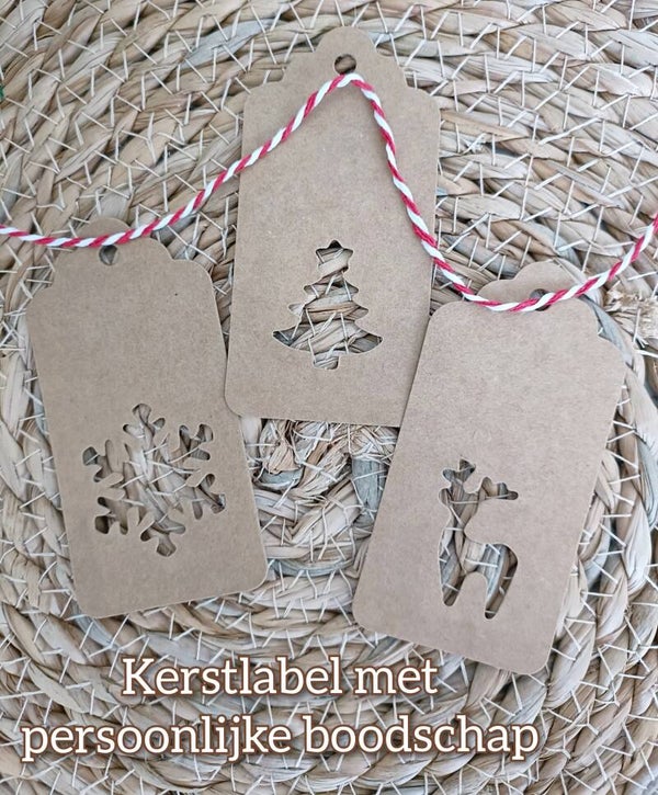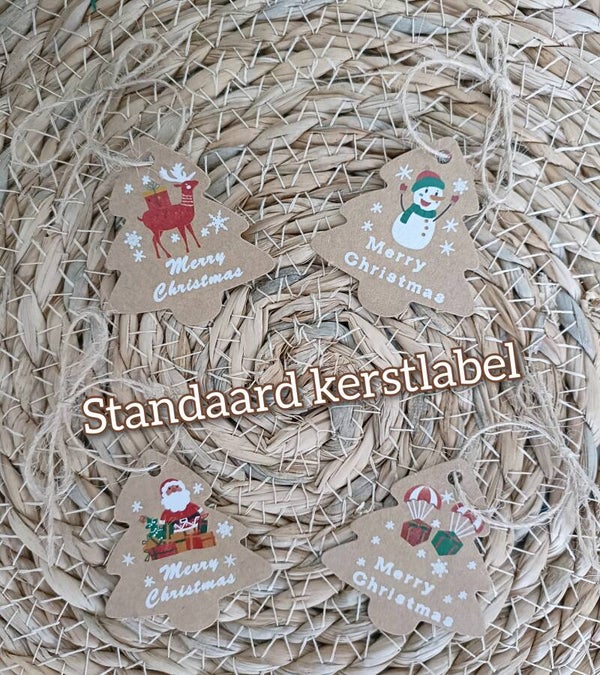 Optioneel kan je een standaard kerst label aan het pakket toevoegen (optie 1) of een kerst label met een korte persoonlijke boodschap (optie 2)
