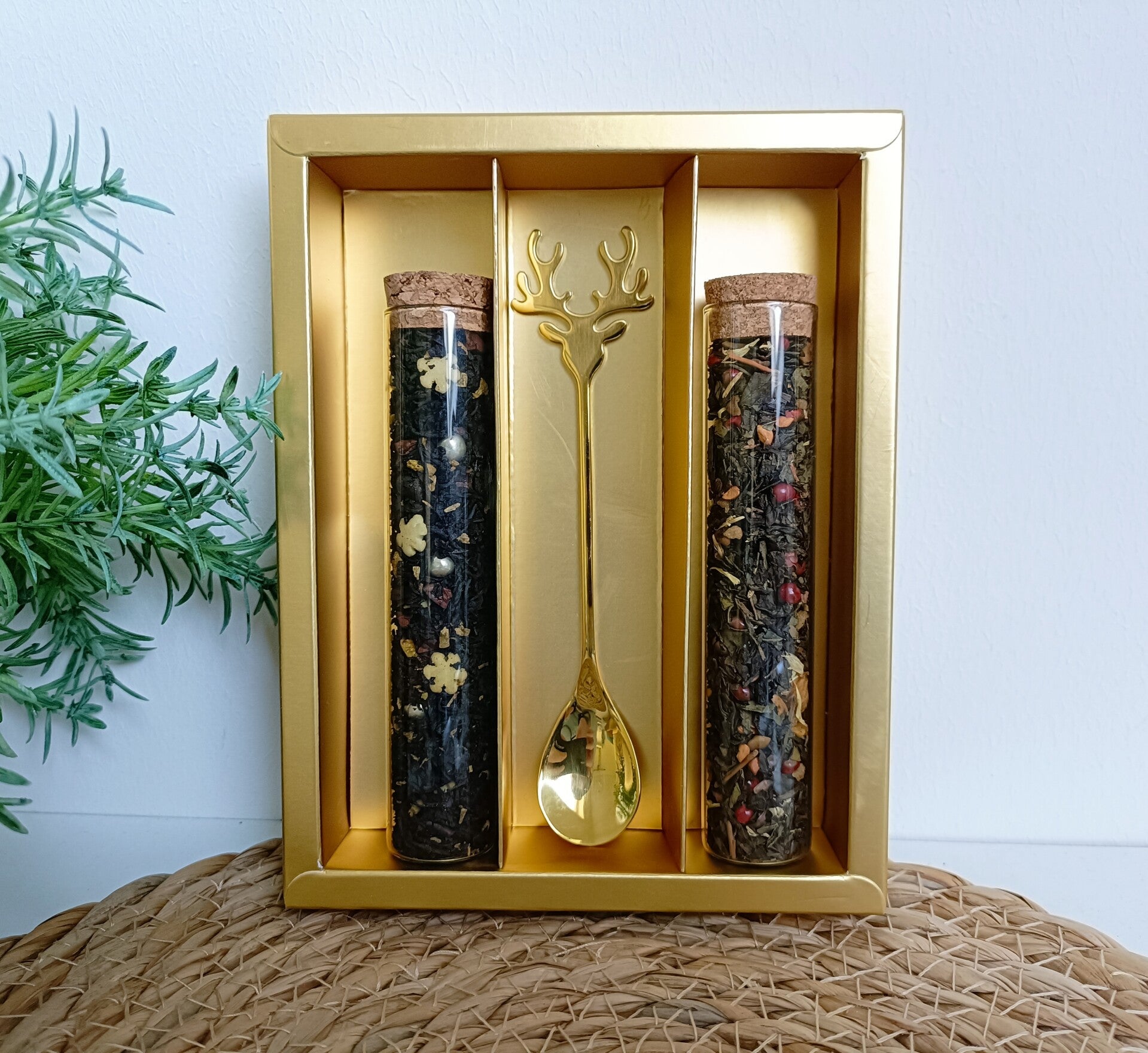 Dit pakket bestaat uit twee tubes met verse kerst thee en een super leuke kerstlepel.